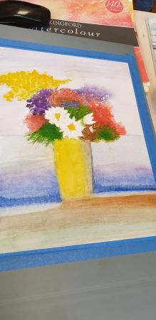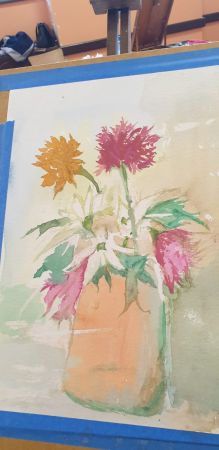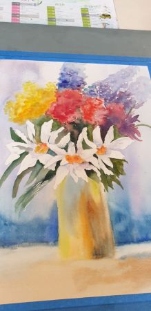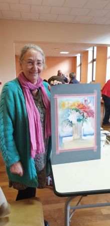 Encore une fois un grand merci à François !!! Nous étions 9 apprentis peintres bien courageux à essayer de reproduire le modèle: des fleurs dans un vase …