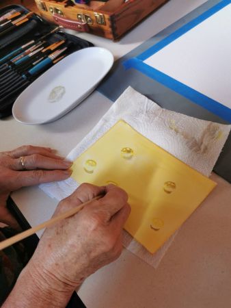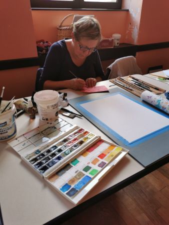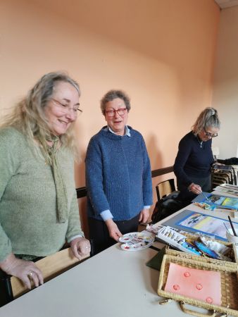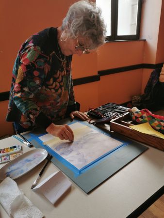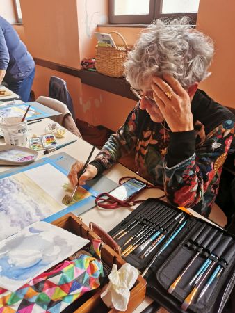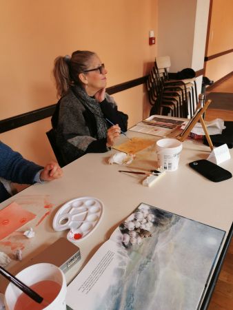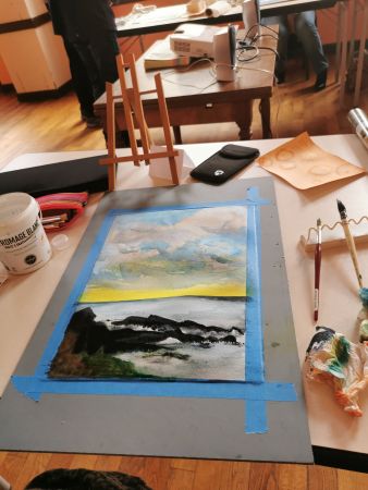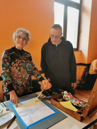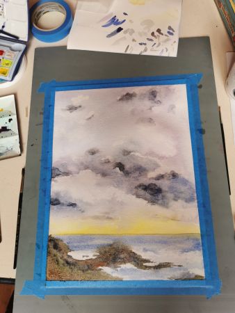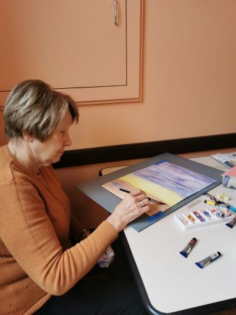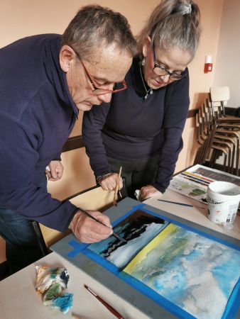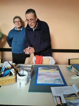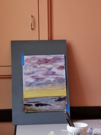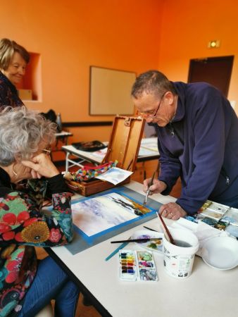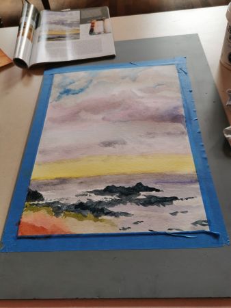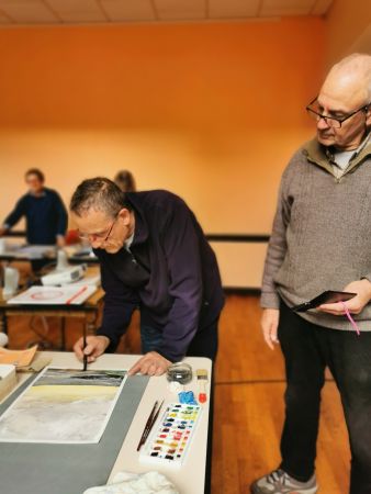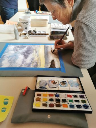 C’était notre dernière séance d’aquarelle de 2023. Pour commencer, François nous avait préparé un exercice pour se délier la main : faire des gouttes d’eau. Plus facile à dire qu’à faire mais nous avons commencé à acquérir la technique de l’estompe. Et cela nous fut bien utile pour réaliser l’aquarelle prévue, un ciel, la mer, l’horizon. Chacun avec son style, nous avons tant bien que mal fini le sujet en 2 h. Mais après quelques corrections par François, nous étions plutôt fiers du résultat.