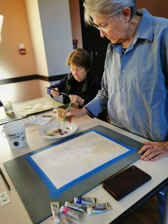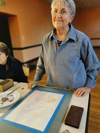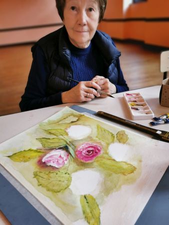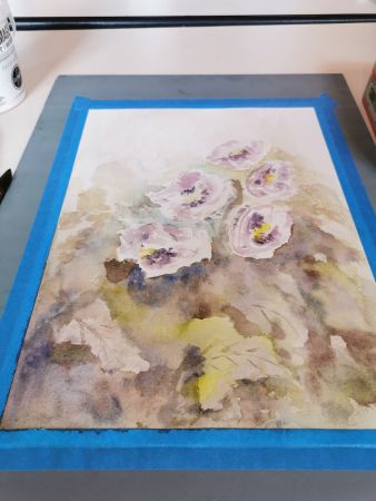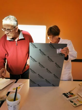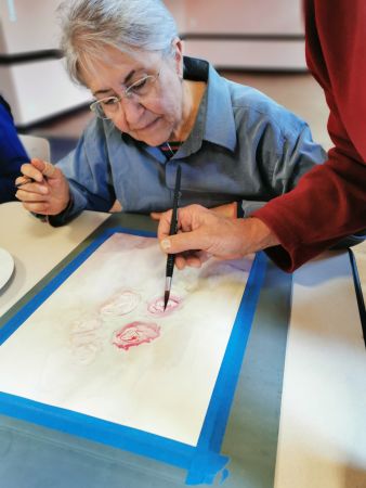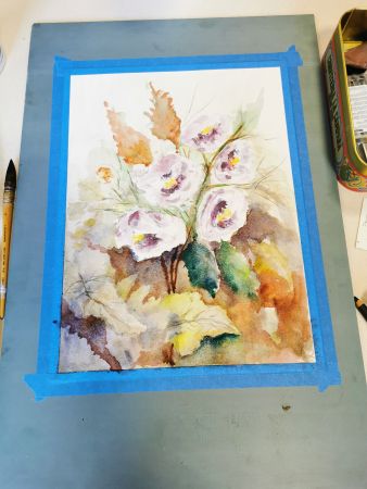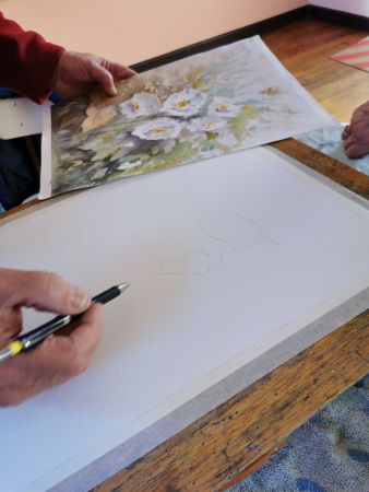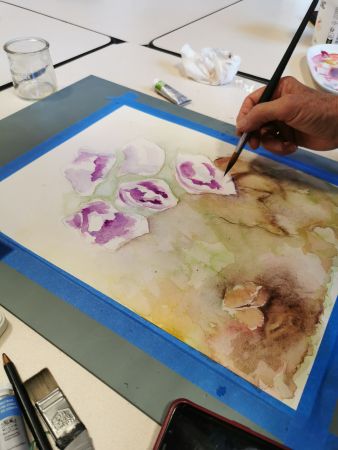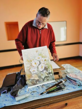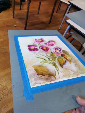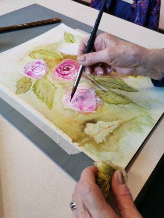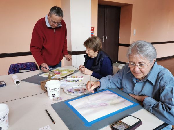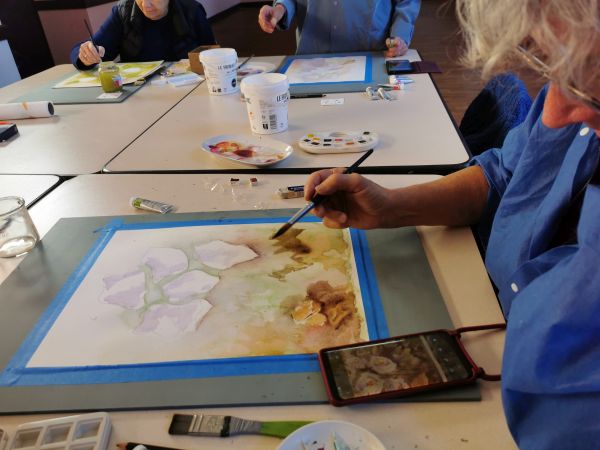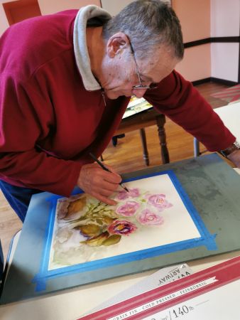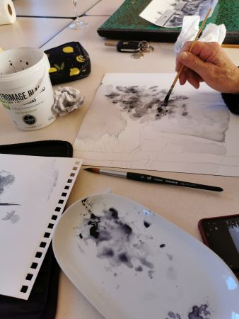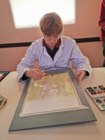 Et c’est là que les Athéniens s’atteignirent. Pfff la galère! D’abord le lavis, puis suggérer les feuilles, souligner les ombres, réserver les fleurs, monter les couleurs. Heureusement, François rattrape les erreurs de 2 coups de pinceau. Et si vraiment c’est raté, il passe tout sous le robinet d’eau et on recommence. Mais quand même, il va falloir s’entraîner…