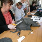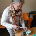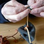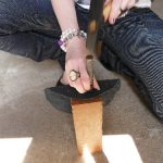 5. Evacuer sa tension nerveuse : poser le cuir sur un rondin, placer un emporte-pièce sur le point blanc et asséner un coup de marteau sec, fort, libérateur ! Enlever et voilà un joli ‘tit trou ! (Opération à répéter 22 fois !)