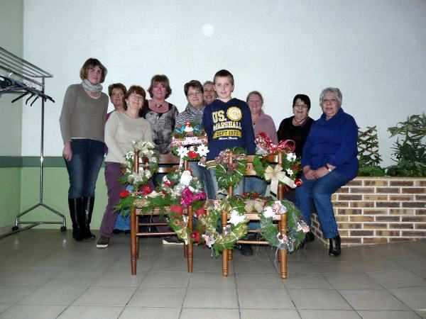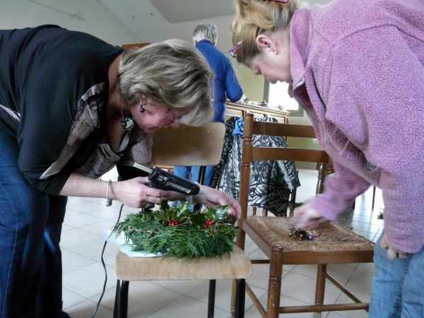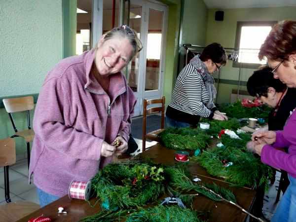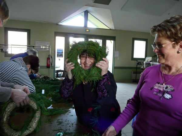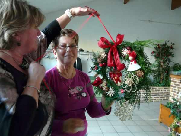 Couronne de paille habillée de sapin, décorée de pignes de pin, de petits fagots, de brindilles, de fruits et champignons rouges, de petits sujets en feutrine, de rubans en taffetas… Il y en a pour tous les goûts. A chacun son style. Les résultats sont tous très différents.