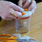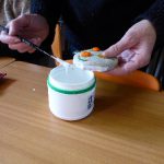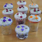 Nous avons enfin collé un joli galon autour du couvercle et voilà… le pot de confiture était décoré de manière délicate, fleurie et colorée !