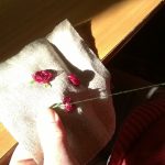 C’est Danièle qui nous a fourni ses précieux conseils et son coup de main lorsque nous faisions une erreur… En fait, nous sommes parties d’un carré de lin où se sont mêlés, avec différentes aiguilles, du fil blanc pour la trame des roses en ruban d’organdi, du vert afin d’y ajouter du feuillage au point de chaînette, des perles et un « charm » ( théière, papillon,…)