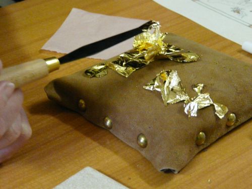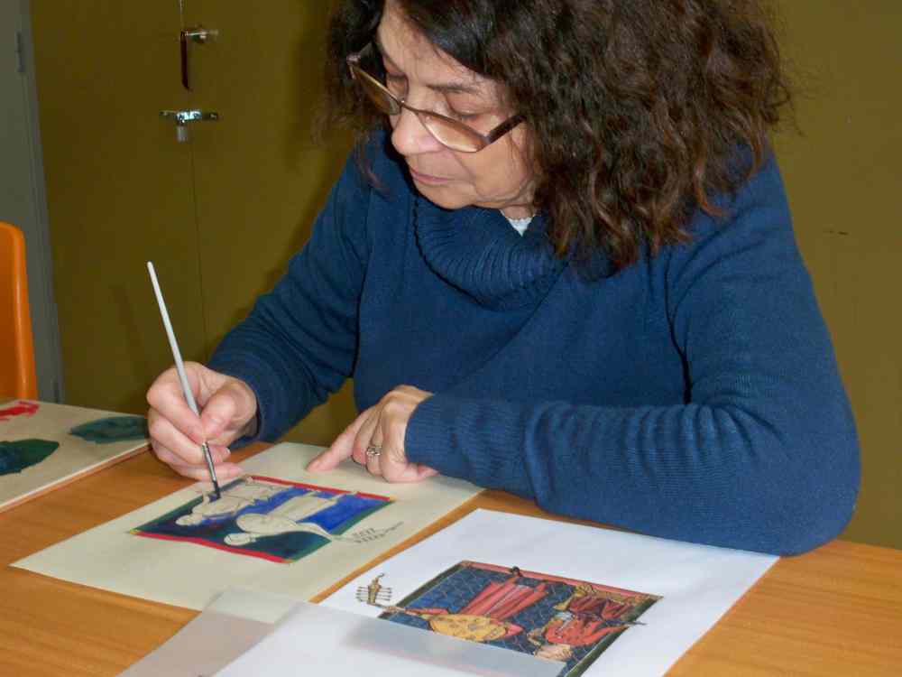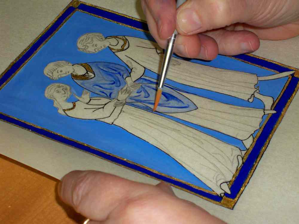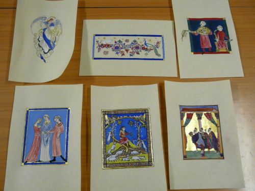 Mais Nadine nous avait prévu un tout autre programme. Car pour apprécier la diversité de la technique de l’enluminure, elle nous avait choisi des images avec pose de feuille d’or, mise en peinture, drapés, visages et mains, bordures et fond, rehauts.