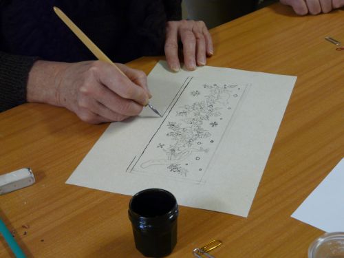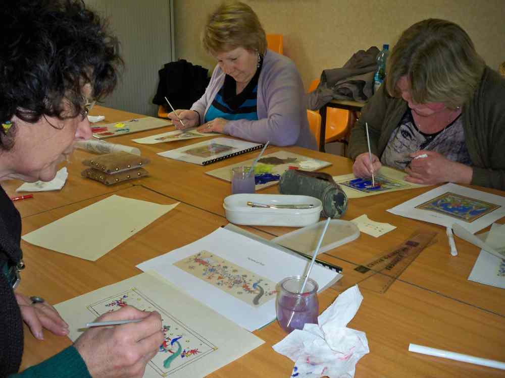Atelier enluminure : nous nous imaginions déjà, tels les moines copistes du moyen-âge, faire de belles majuscules pour illustrer la 1ère page d’un manuscrit…