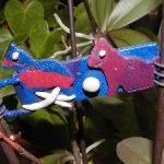 Petit souci, le temps est froid, et, forcément, le matériau ….. dur ! Il nous faut le pétrir, l’écraser, le rouler dans nos paumes de mains pour réussir à le travailler. Chacune s’y emploie de son mieux et après plusieurs passages dans la machine, nous obtenons une fine bande à découper, à l’aide des différents emporte-pièces proposés par Astrid. Sa patience fait merveille, ici conseillant, ici encourageant, elle est irremplaçable ! L’imagination des participantes, les associations de couleurs et des formes ont des rendus très personnels et les réalisations, après un passage au four, et l’application d’un vernis sont prêtes pour affronter frimas et soleil au jardin.