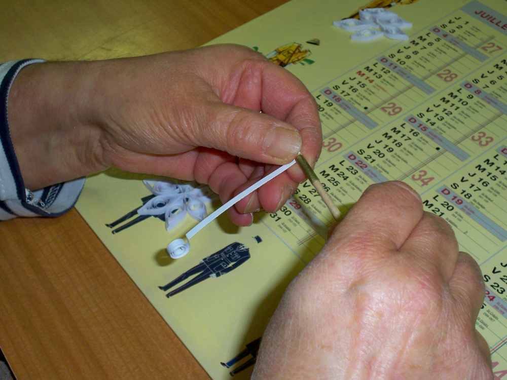Et nous voilà lancées ; mais là, tout se gâte. Ce qui apparaissait simple, fait par Valérie, est en fait très minutieux. Il faut enrouler le papier serré pour telle forme, pour l’autre il doit être relativement lâche pour pouvoir le retravailler …. Et les apprenties doivent, plusieurs fois, reprendre leur ouvrage.