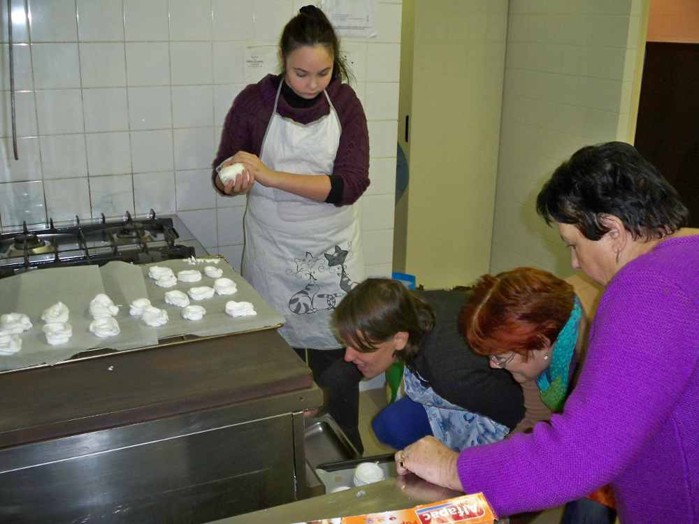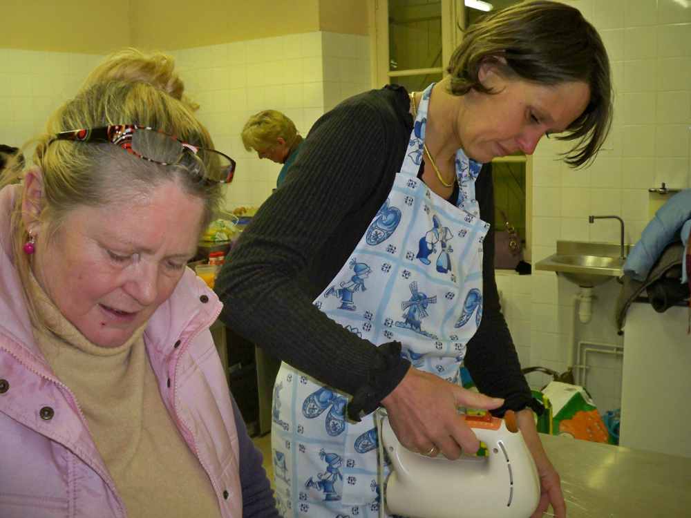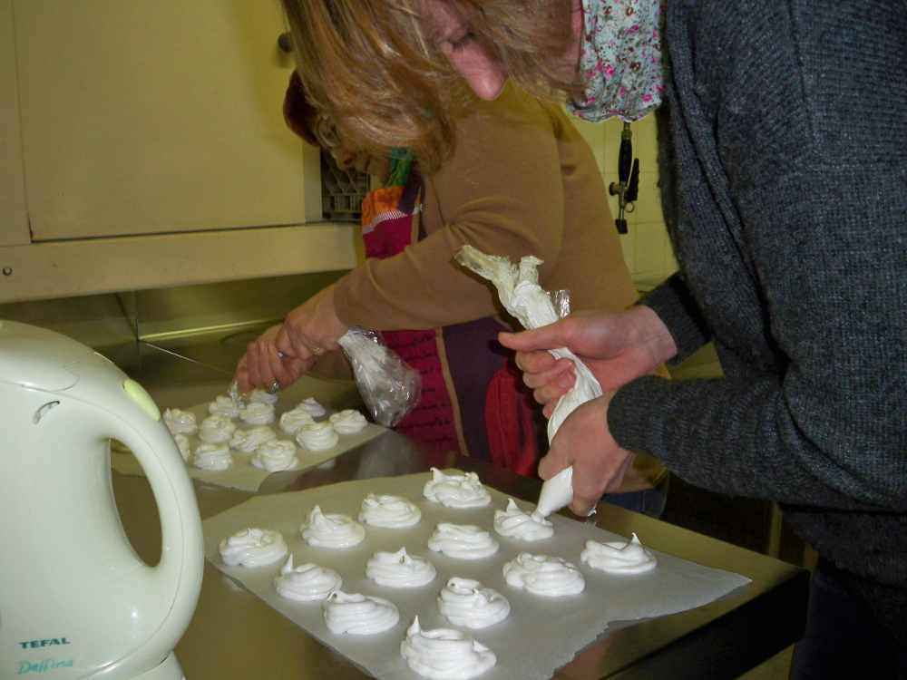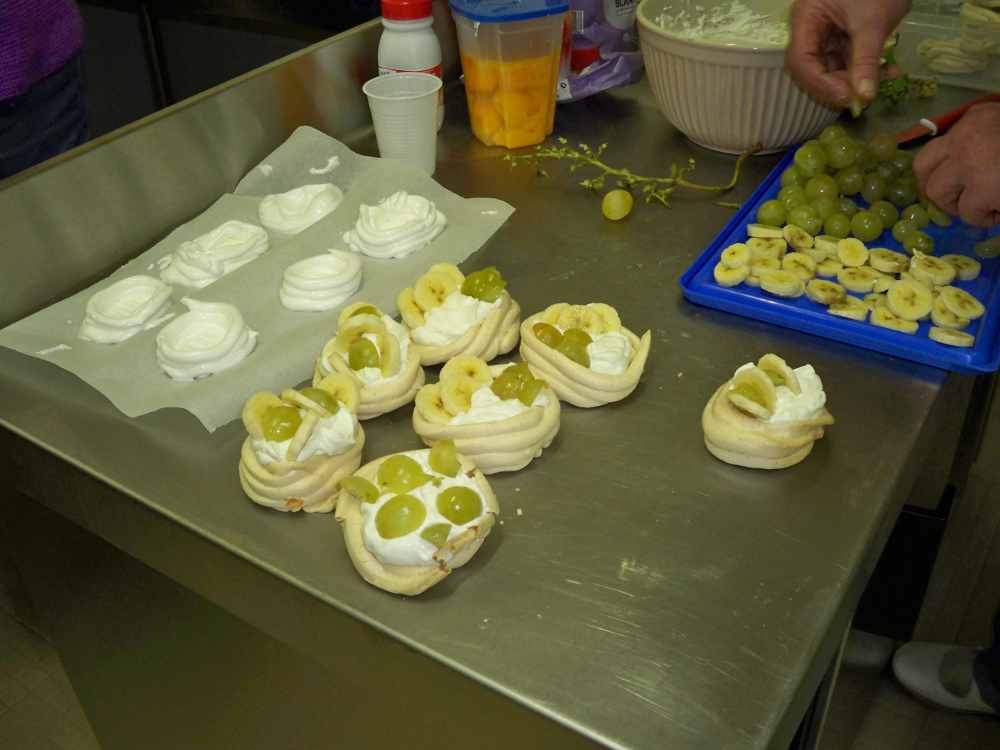 Allison nous présente les ingrédients et aidée par Letty pour les traductions, chacune se lance dans sa réalisation. En fait, la préparation n’est pas compliquée et ensuite, en attendant la cuisson, très douce, nous allons déguster les « nids en meringue » préparés par notre « Chef étoilée » du jour, garnis avec une chantilly sans sucre, des raisins et des bananes et accompagnés d’une tisane.