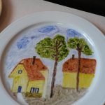 Nous voici face à trois pièces blanches: une assiette, un vide poche et un bol. A nous de les décorer. Après quelques hésitations, nous laissons faire notre imagination ou nous nous inspirons de modèles mis à notre disposition.