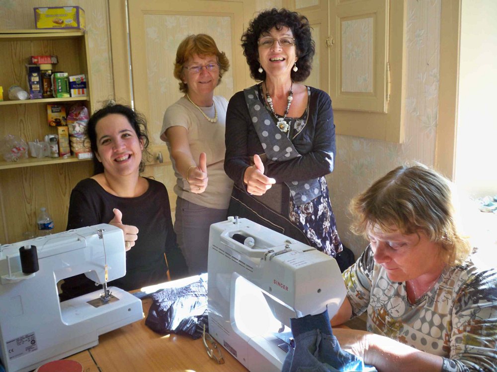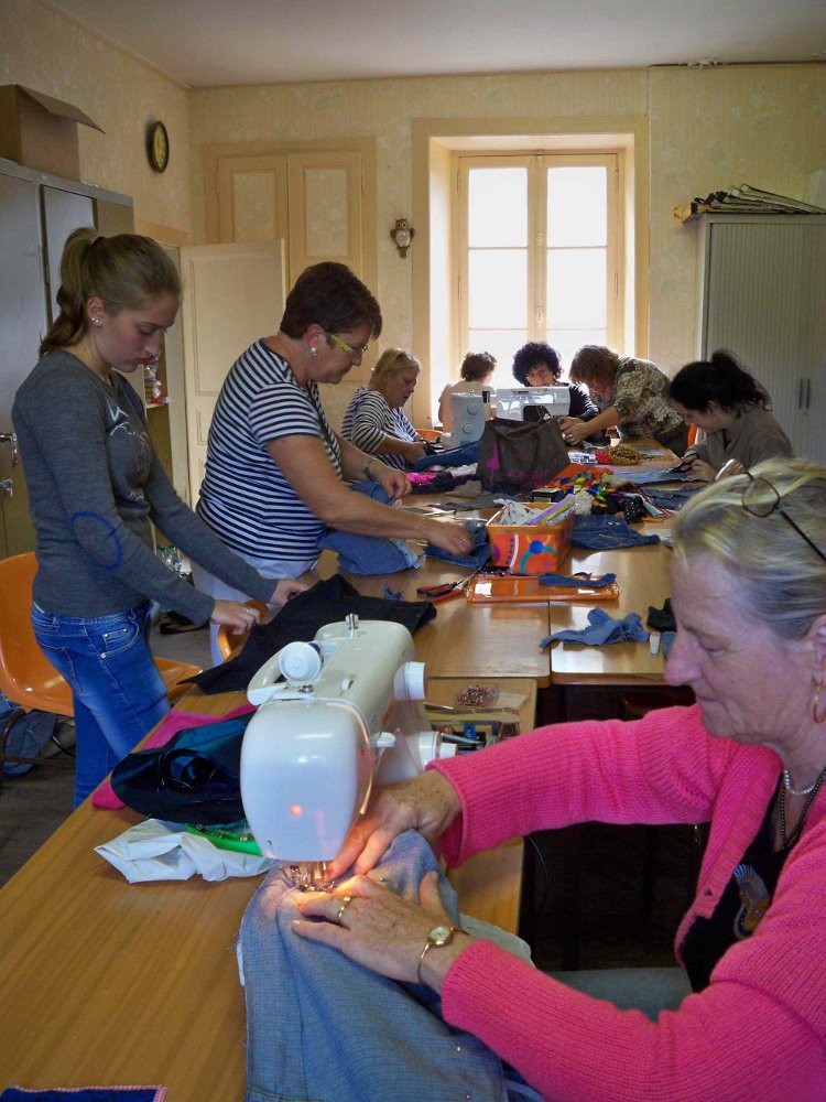 Avant cela nous avons fait parlé les aiguilles et surtout fait ronfler les machines à coudre dans une bonne ambiance. Encadrées et guidées par Dominique, nos anciens habits se sont transformés, customisés avec des tissus et éléments de toutes formes et toutes couleurs.