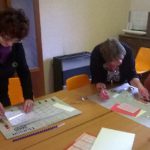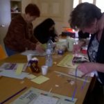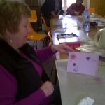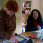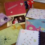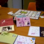 Une présentation de papier cartonné nous a été faite et laissée à notre choix pour constituer les pages de notre album. Après choix et composition nous avons pu le denteler sur les bords avec différentes perforeuses mises à disposition par Astrid. Nous avons installé une reliure plastique pour réunir nos pages , ensuite, nous avons laissé courir notre imagination avec des fleurs, des perles, les objets, des rubans, des boutons et découpures pour décorer chacune de nos pages.