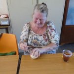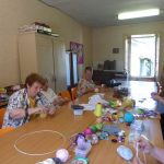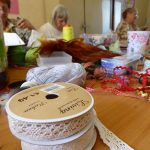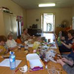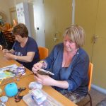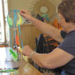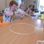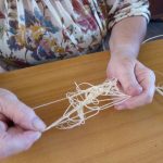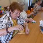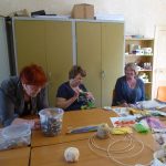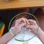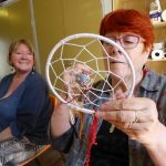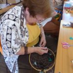 Au travail : tout d’abord entourer le cercle fourni par notre professeur du jour ; toutes sortes de matériaux sont à notre disposition : de la laine, des rubans multicolores, des fils …… au choix de chacune ; ensuite confectionner une « toile d’araignée » pour garnir le cercle. Et, enfin installer une décoration qui captera nos futurs rêves.