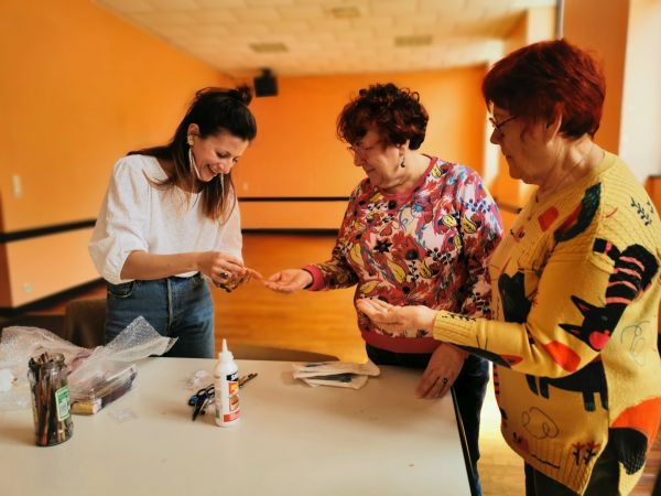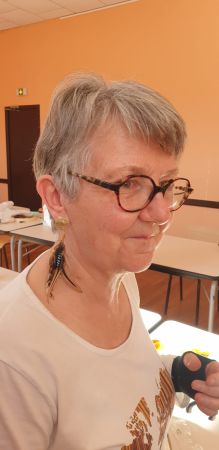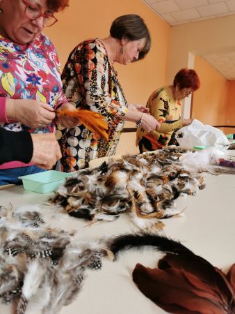 Émilie est plumassière de métier, habite à La Croisille, et elle nous a gentiment proposé d’animer gratuitement un atelier. Jackye, Annick et Eliane ont plumé les poules d’Irène et nous avions un stock impressionnant de plumes. La technique est simple mais minutieuse. Attention ne pas éternuer, ni parler trop fort, tout s’envole…