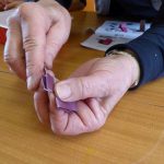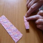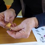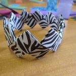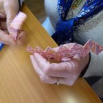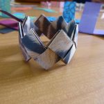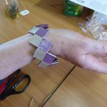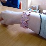 Irène avait déjà préparé et découpé les papiers (20 par bracelet de 2 cm sur 12). Elle nous explique une 1 ère fois, on ne comprend pas tout. Elle ré-explique en français… en anglais… On se lance dans le pliage. Ça c’est OK. Maintenant l’assemblage. C’est plus compliqué. On fait, défait, refait dans la joie et la bonne humeur. Mais le plus difficile, c’est la fermeture. Irène termine notre ouvrage.