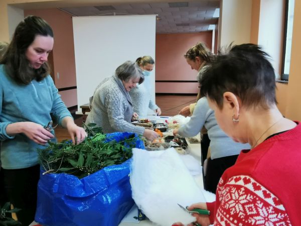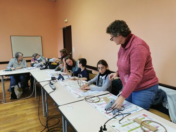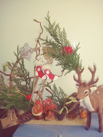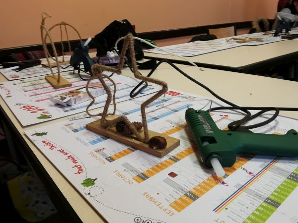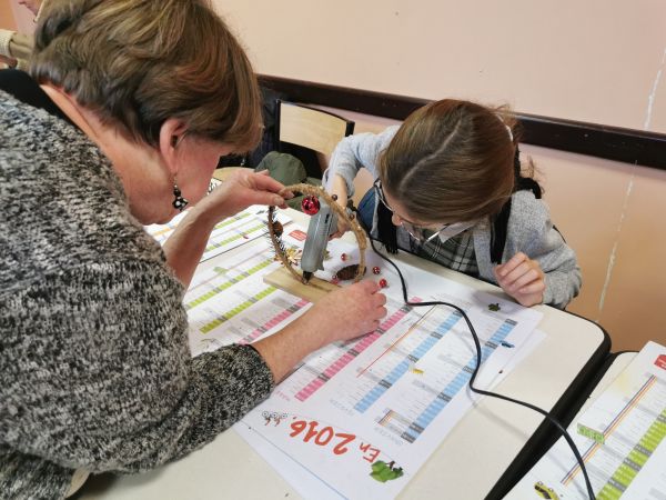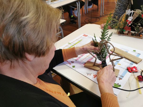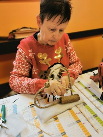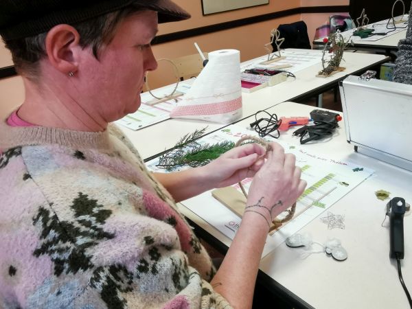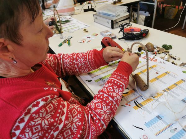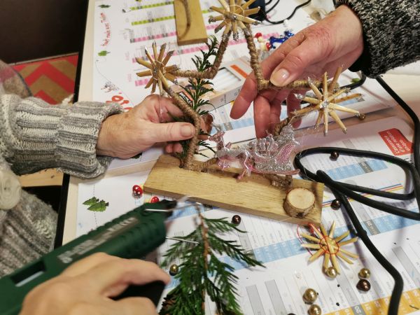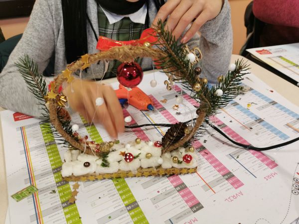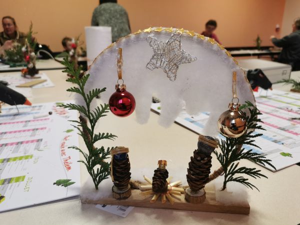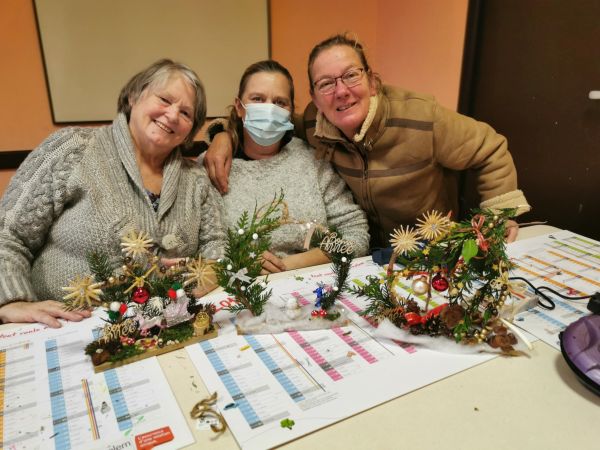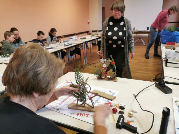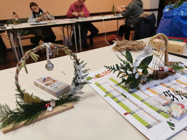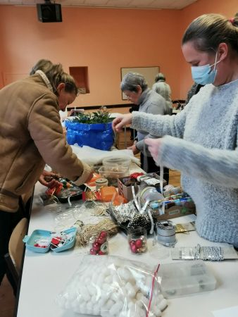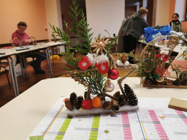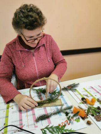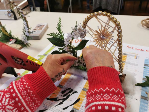 Une petite planche de bois nous sert de base pour coller soit un cercle, un cœur ou une étoile. Ensuite place à l’imagination. Nous avions à disposition une quantité impressionnante de petites décorations, boules, rubans, perles, pères Noël, étoiles, éléments naturels comme des pommes de pin, feuilles, branchages, houx… Chacun a laissé libre cours à son inspiration. Comme toujours les résultats sont très différents et très réussis.