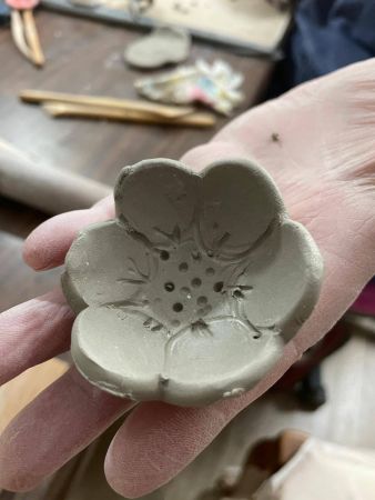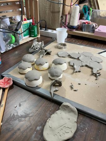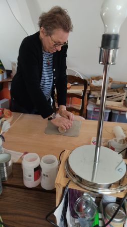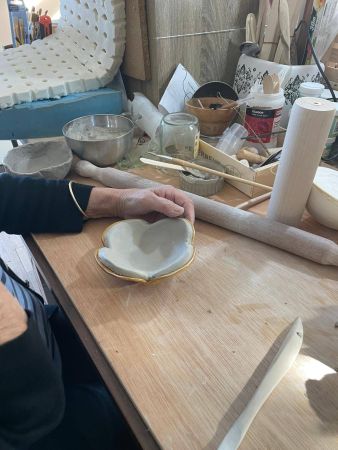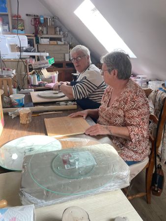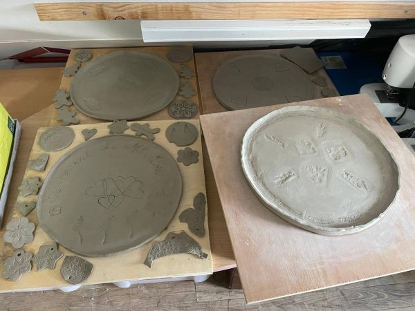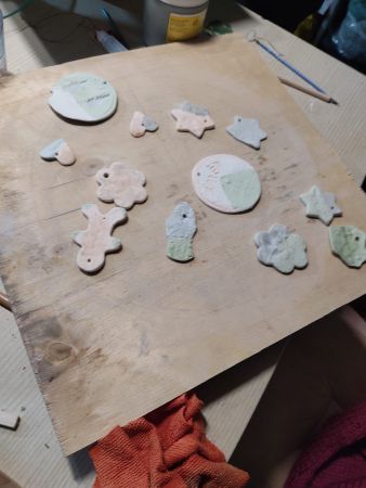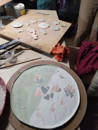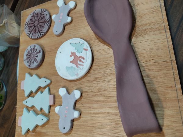 Nous avons bien travaillé, dans la bonne humeur en apprenant à créer de beaux plats pour le service et des décorations de Noël. Tout sera émaillé la semaine prochaine avant la mise au four.