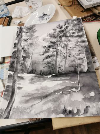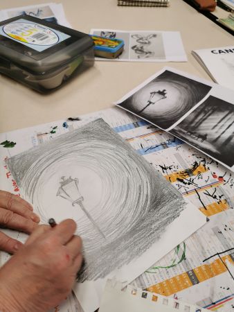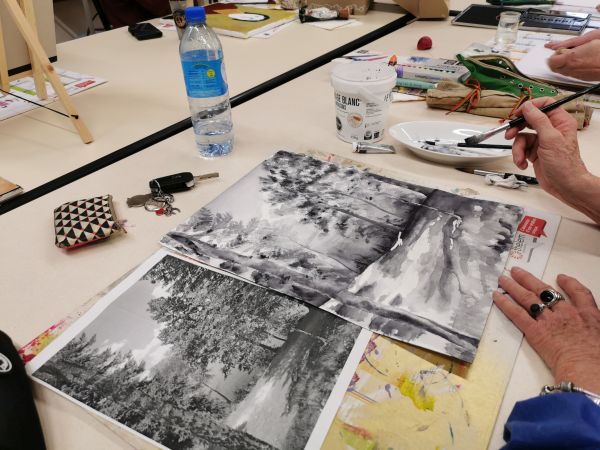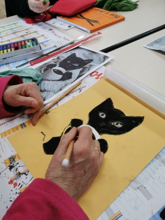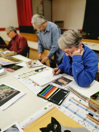 Nous voilà équipés pour reprendre nos projets, Édith et son nez de clown, Eliane et son paysage en aquarelle, Sylvie et son magnifique animal, Joëlle et son chat, Nicole son paysage à l’huile, Gérard et son Modigliani…