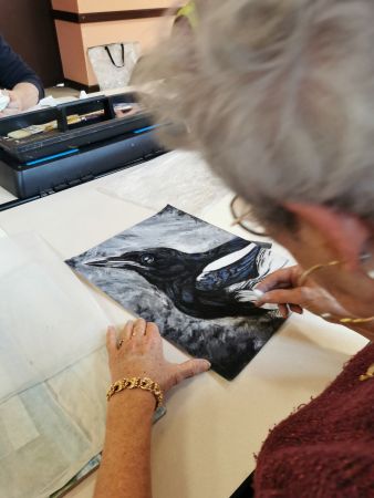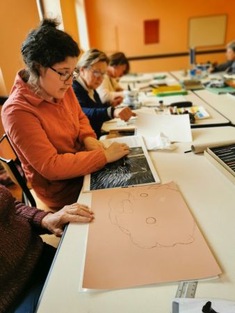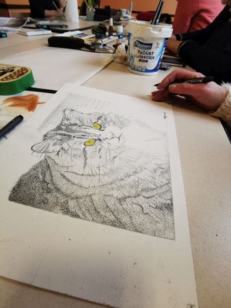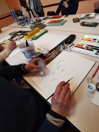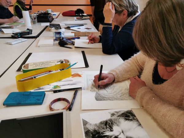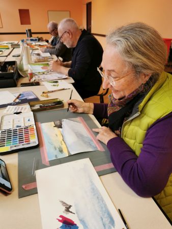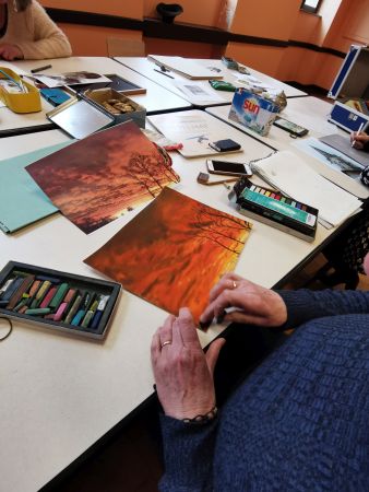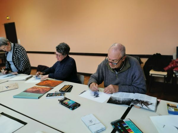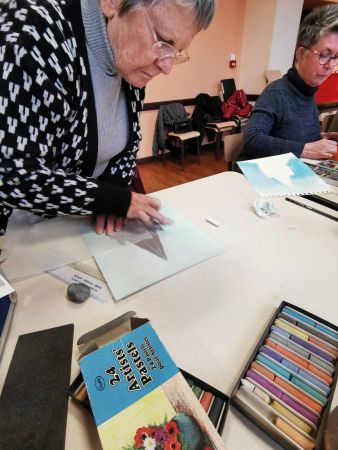 Ce cours avec Liliane a permis à certains de peaufiner ce qu’ils avaient commencé : rajouter du blanc pour donner un éclat de lumière, accentuer les contrastes, fixer le pastel avant de faire les détails.