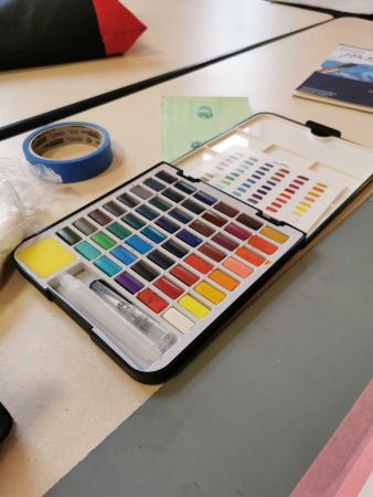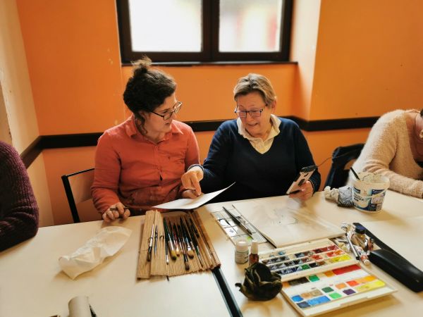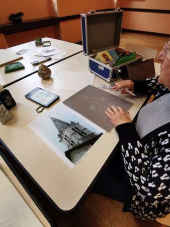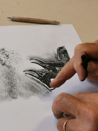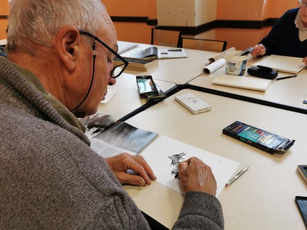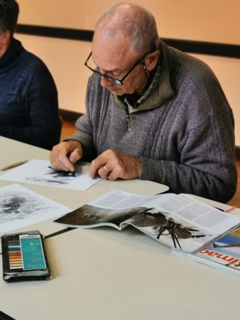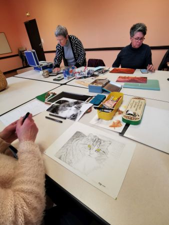 Des nouvelles têtes se sont jointes à nous. Pour ces personnes, Liliane a aidé au choix du matériau, fusain, pastel, aquarelle et les a guidé dans la technique. Merci Liliane.