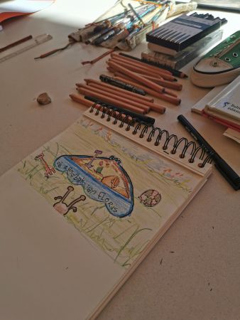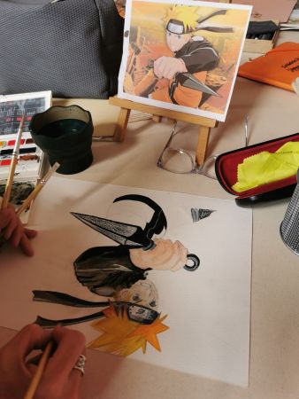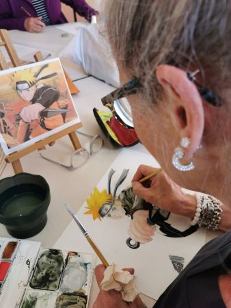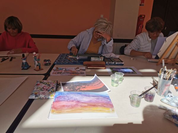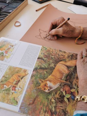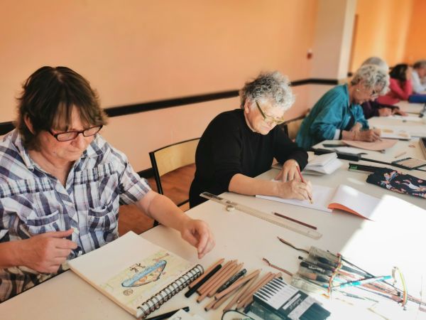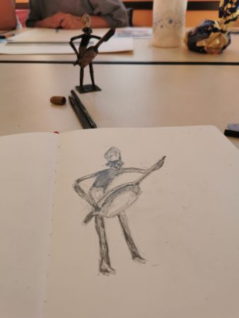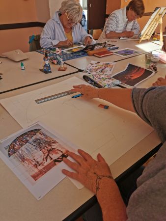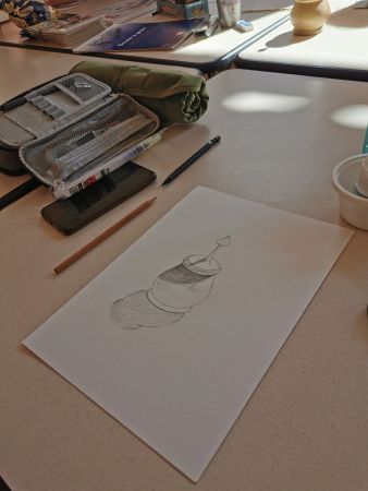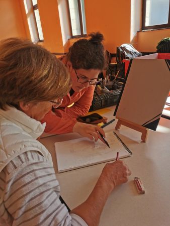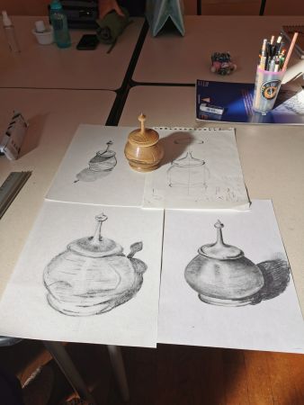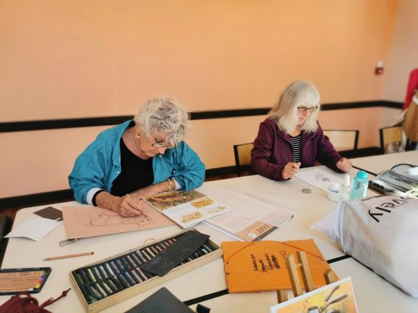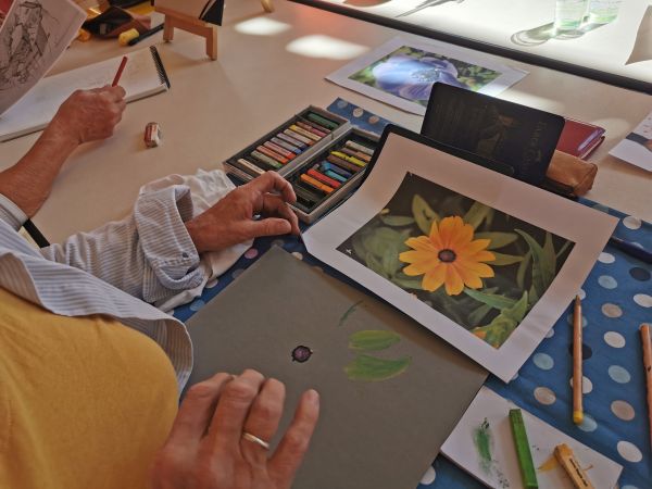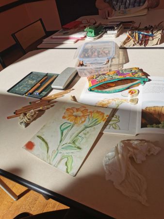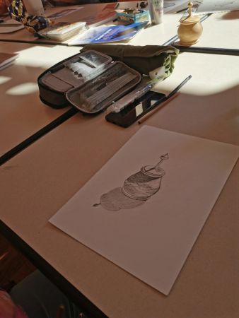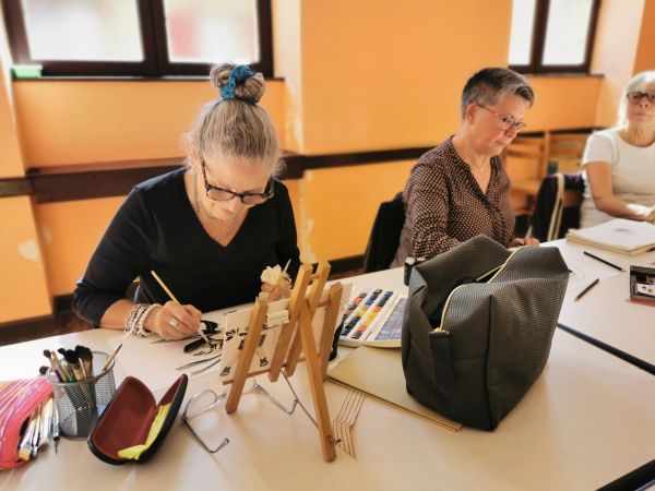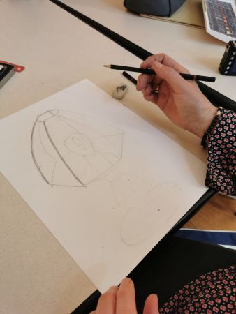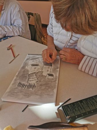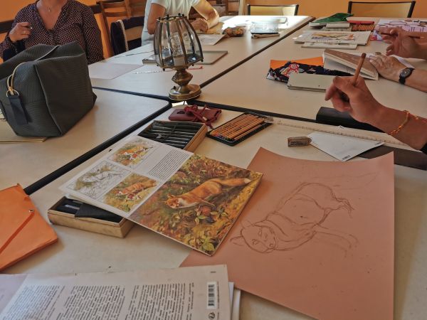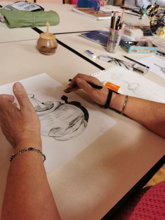 Elle nous avait préparé différents objets à dessiner au crayon ou au fusain. Mais certaines avaient déjà réfléchi et ont préféré le pastel, ou l’encre, ou l’aquarelle.
