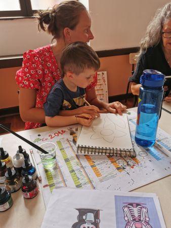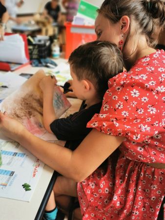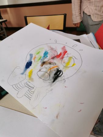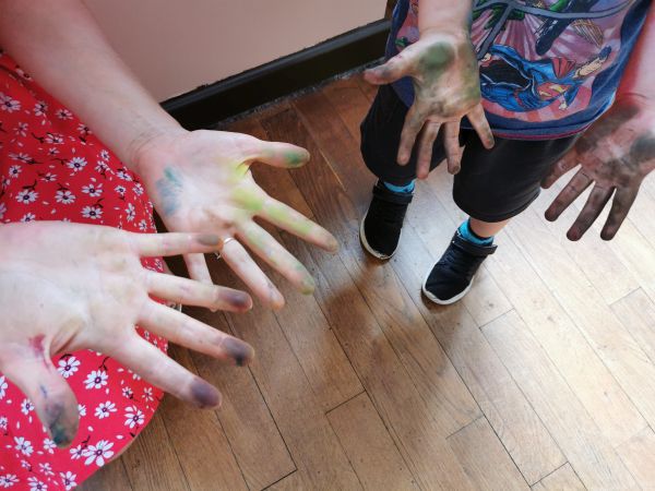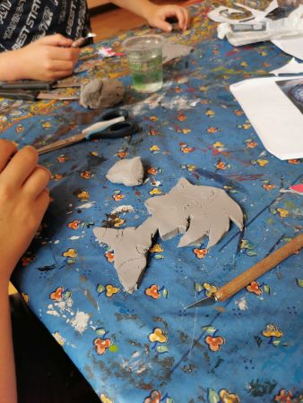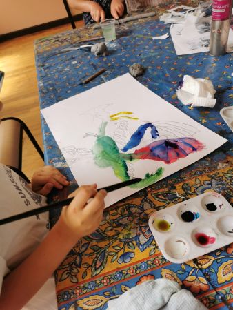Liliane a eu fort à faire cette après-midi car les enfants étaient contents de venir au cours. Ils ont modelé de l’argile, peint à l’encre des dragons, des dinosaures, expérimenté avec leurs petites mains..