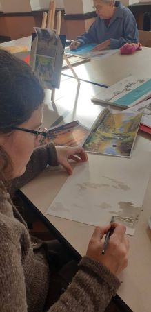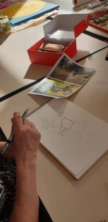 Séance de dessin/peinture…avec Liliane : de l’encre, du pastel, des crayons…