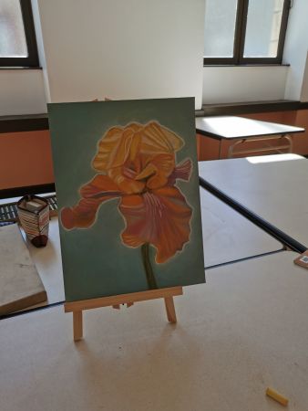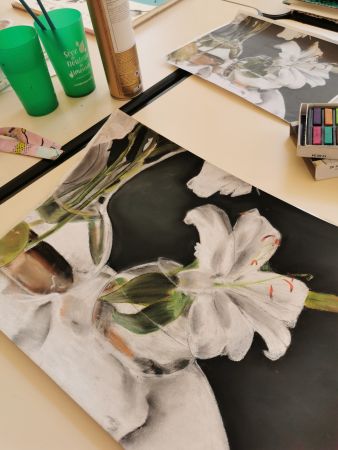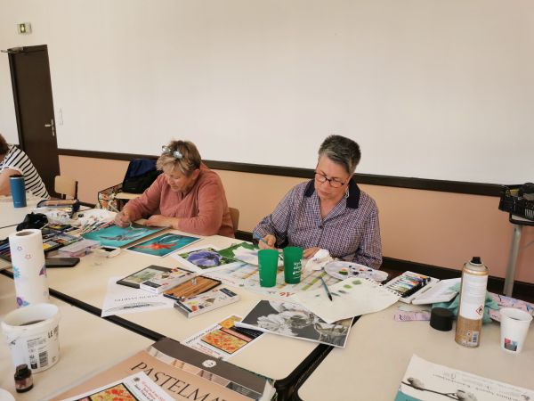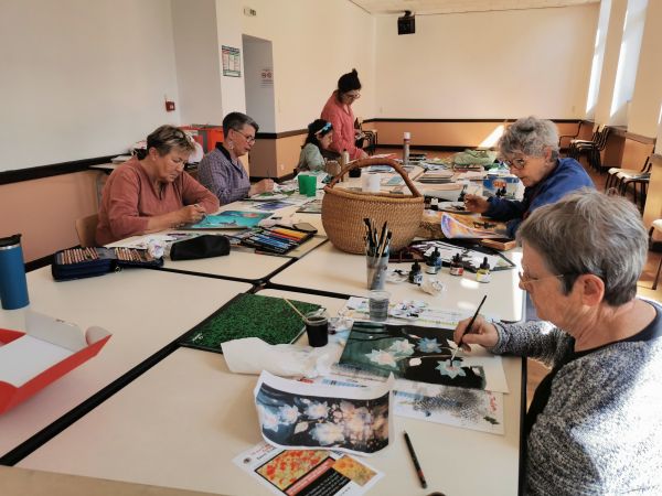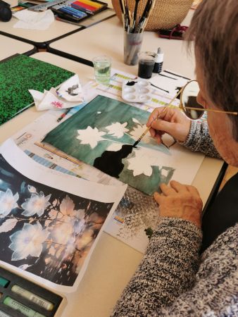 Joëlle essaye l’aquarelle, Eliane peaufine sa technique à l’encre pendant que Nadine et Astrid utilisent le pastel. Fio poursuit ses fleurs.