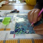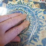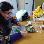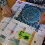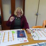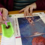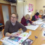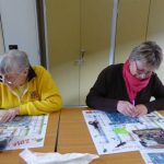En fait de diamants, ce sont de petites « perles » à facettes type diamant. Elles sont à déposer à des emplacements repérés par des numéros. C’est une activité calme, méditative dirait Letty mais qui permet aussi la discussion en groupe. Beryl avait prévu de nombreux motifs pour satisfaire tout le monde. Nous ne verrons pas le résultat final car il faut un certain temps pour finir le petit tableau proposé. Nul doute que chacune terminera son ouvrage à la maison.