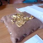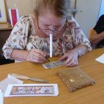 - Poser le mordant (une sorte de colle dont la composition est une recette personnelle de Nadine) qui recevra la feuille d’or.