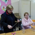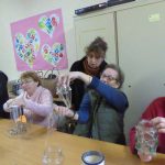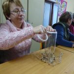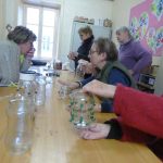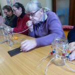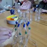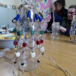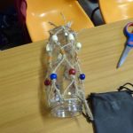 Nous plaçons qui une perle, qui un bouton, entre deux nœuds jusqu’à couvrir la totalité de notre pot en verre. Les réalisations sont différentes, laissant libre cours à l’imagination de nos participantes.