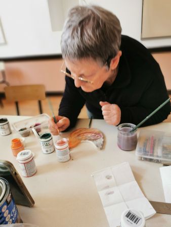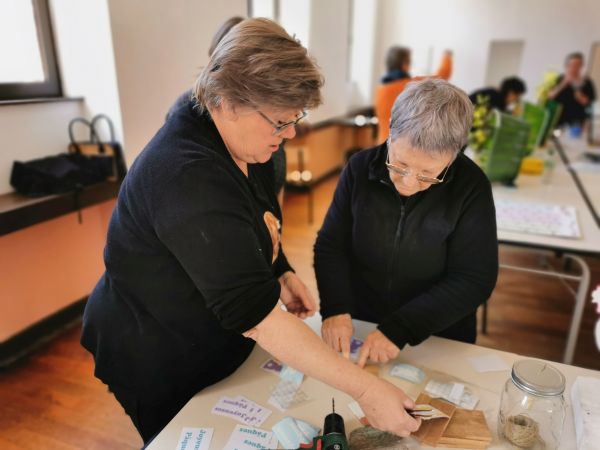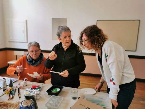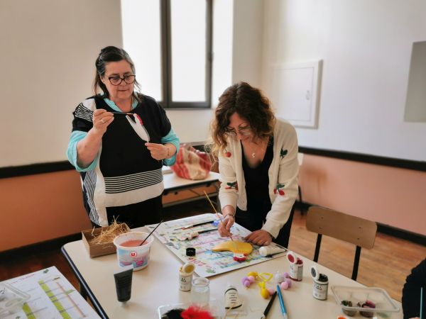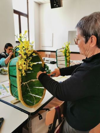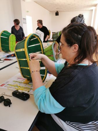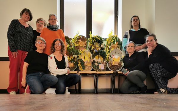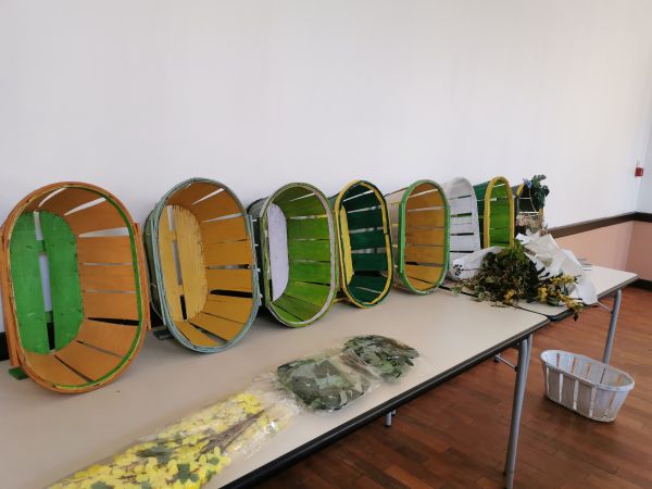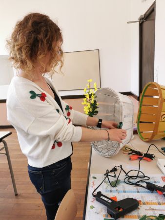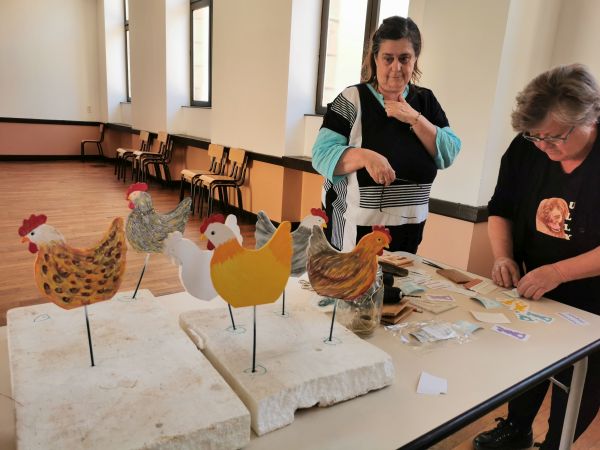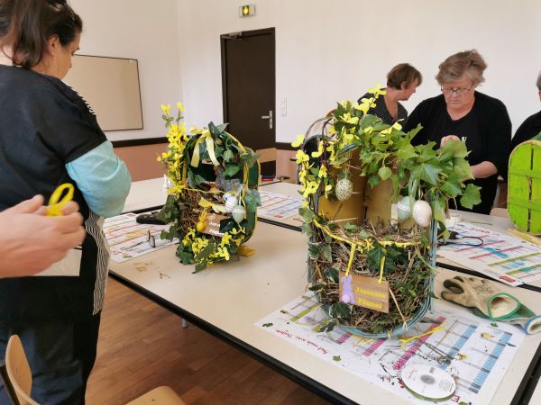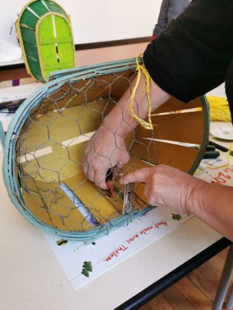 Marij et Astrid avaient tout préparé : elles avaient peint les paniers, découpé à la scie les silhouettes des poules, coupé le grillage, ramassé le lierres et autres feuillages. Il nous restait à peindre chacune à notre façon les poules, agrafer le grillage et imaginer la déco.