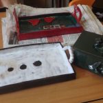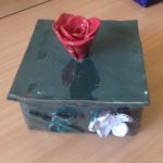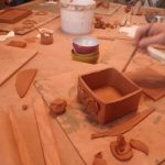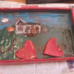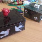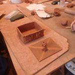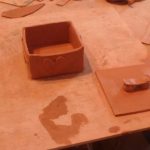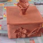 Avec patience, on a créé un boîte avec couvercle ou un petit plateau. Après le vernis! Difficile, car les couleurs sont différentes du résultat après cuisson. Une vraie surprise.