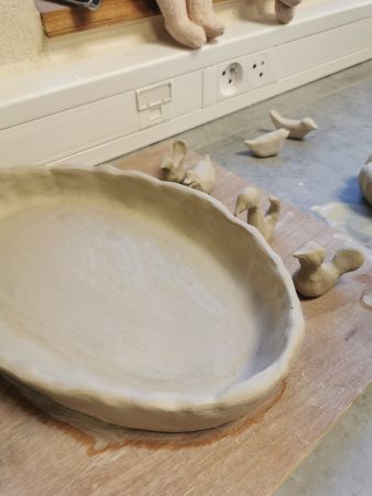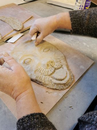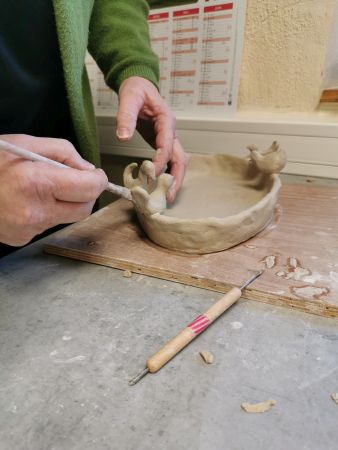 Un bel atelier poterie chez Heidi cet après-midi pour préparer le printemps. On avait le choix, des bains pour oiseaux, des fleurs ou feuilles à mettre dans les parterres ou tout autre idée. Marij a préféré faire le portrait de son chien à accrocher dehors. Le goûter préparé par Petri était magnifique comme d’habitude et a permis une pose pour bavarder entre amis. Merci à Heidi et Petri pour ce bel atelier.