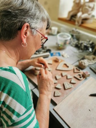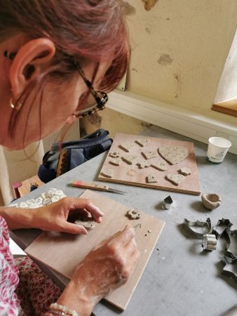 Heidi nous guide, technique de la plaque avec les emporte-pièces pour découper, de la boule creuse pour le mouton etc… Nous pétrissons, malaxons, étalons.