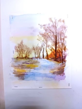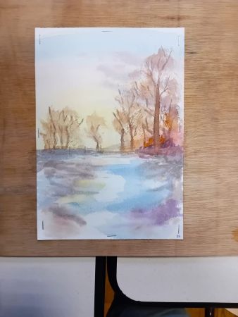 Loïc a expliqué longuement les différentes techniques utilisées en aquarelle. Il a su prévenir les difficultés en nous guidant pas à pas. Les esquisses données, nous avons appris à poser les différentes couleurs en utilisant la méthode mouillé sur mouillé. Le moment magique apparaît sous nos yeux lorsque les peintures fusent.