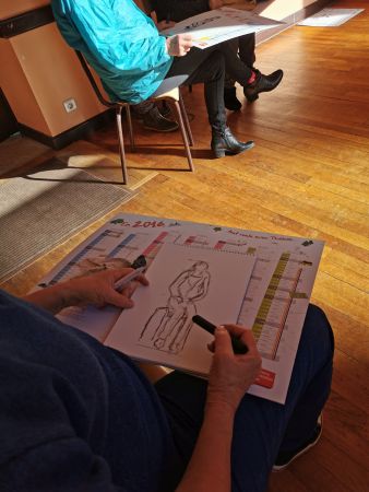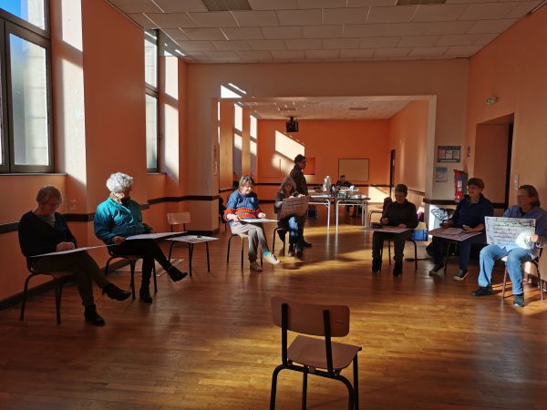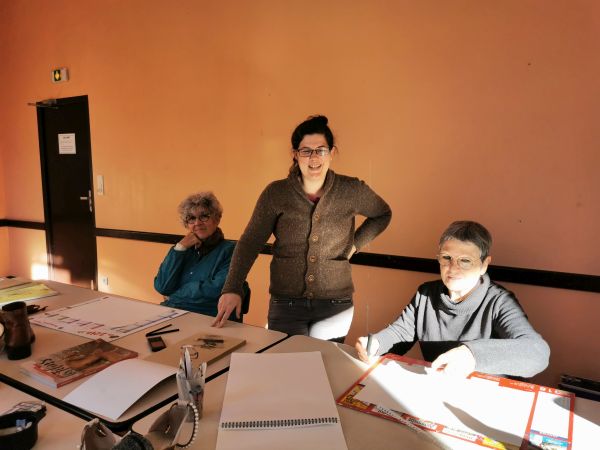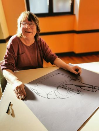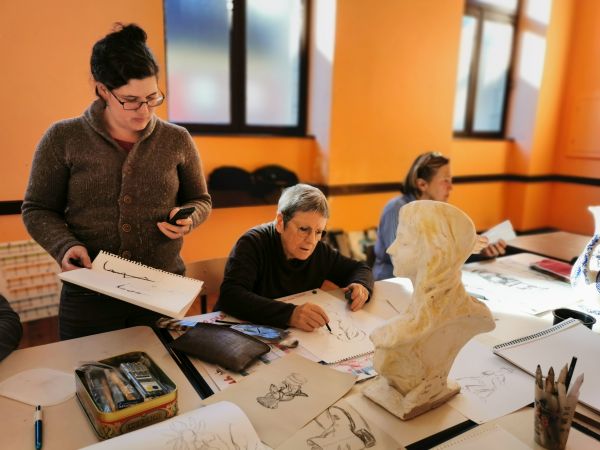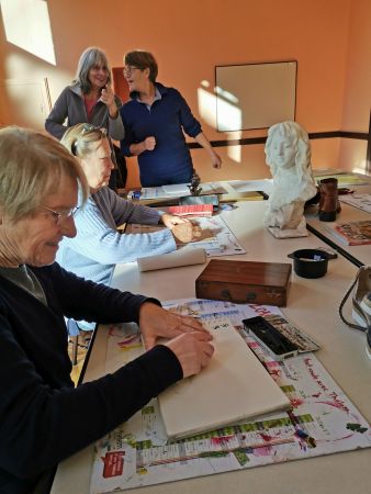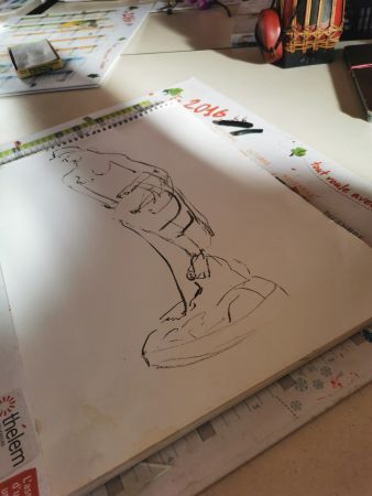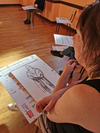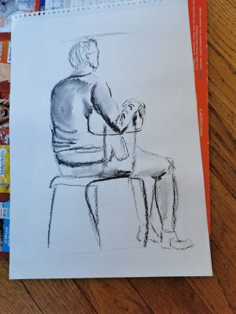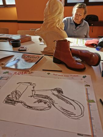 La première était consacrée aux esquisses rapides. Chrono en main, Liliane nous a donné différents objets à croquer. Et pour finir, nous nous sommes tirés le portrait, de face, de profil, de dos, les bras croisés ou pas… Pas facile d’aller vite et de garder juste le nécessaire.