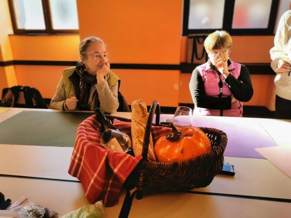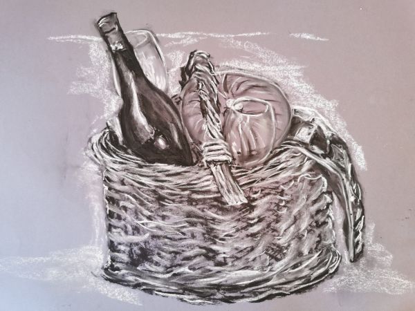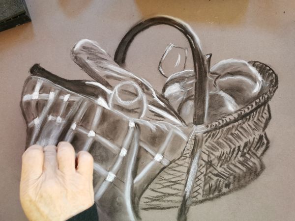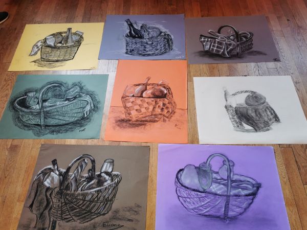 La seconde séance, nous avions une nature morte à réaliser en 2 heures. Joli panier bien garni mais suivant l’angle sous lequel il nous apparait, tout change. Avec plus de temps, on peaufine les ombres, les volumes.