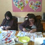 Ensuite, chacune selon son envie, nous avons découpé, précautionneusement, avec les ciseaux ou effiloché la serviette. Le collage s’avérait périlleux : trouver la bonne quantité de colle et au pinceau, appliquer le décor, sans le déchirer, et sans faire de pli. Pas évident.
