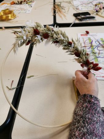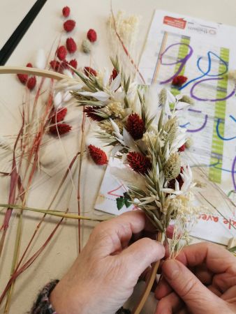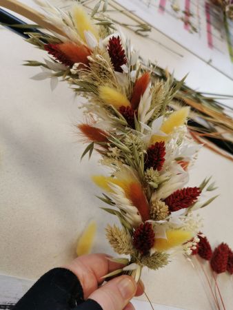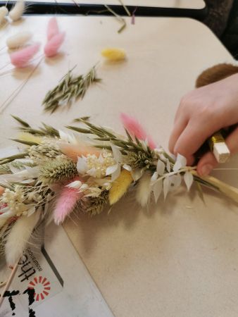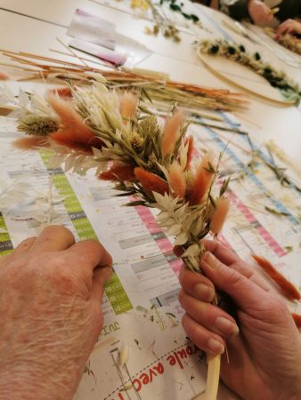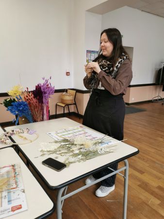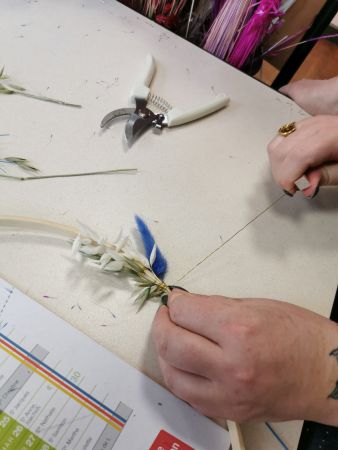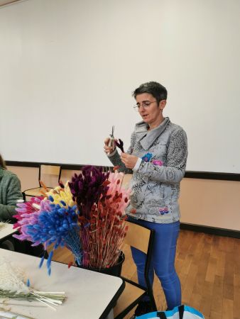 Mélanie a mis toute son énergie et son professionnalisme pour nous guider dans la création de ce défi floral. Déjà, bien choisir les tons, comprendre comment commencer, essayer de répartir les différentes fleurs proposées en alternance de couleurs.