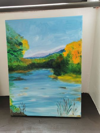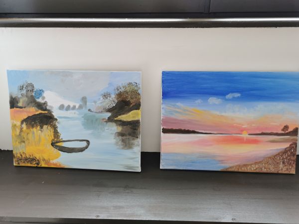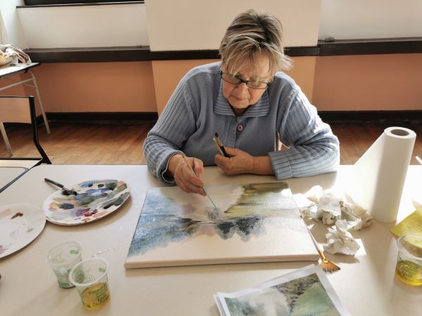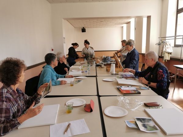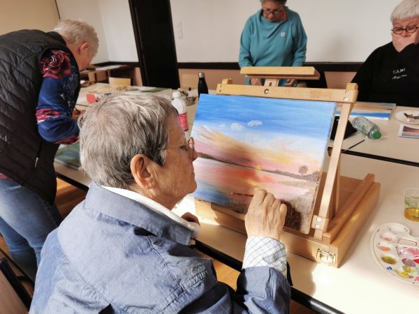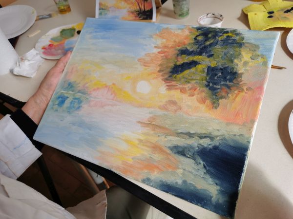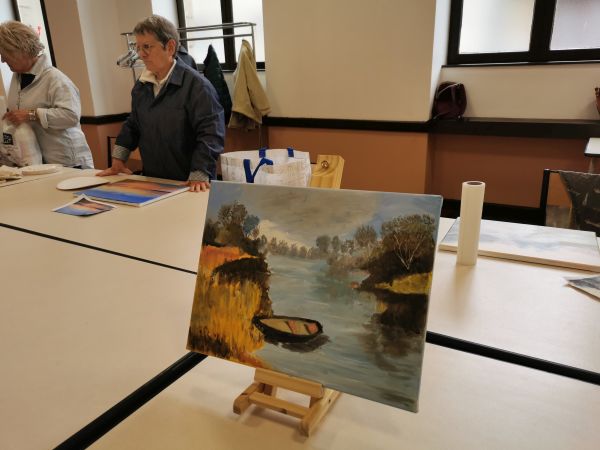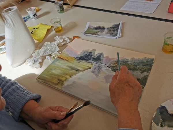 Pendant les deux premières séances Liliane nous a expliqué comment peindre à l’huile. Nous avons utilisé des médiums (huile de lin et essence à la térébenthine) à la place de l’eau pour diluer nos peintures. Ensuite nous avons choisi un modèle et nous nous sommes lancées. Liliane était là pour nous accompagner nous encourager nous guider nous conseiller. À la fin de la deuxième séance certaines participantes avaient plus ou moins fini leur tableau. Il a fallu attendre 10 jours avant de nous retrouver. La peinture à l’huile est longue à sécher.
