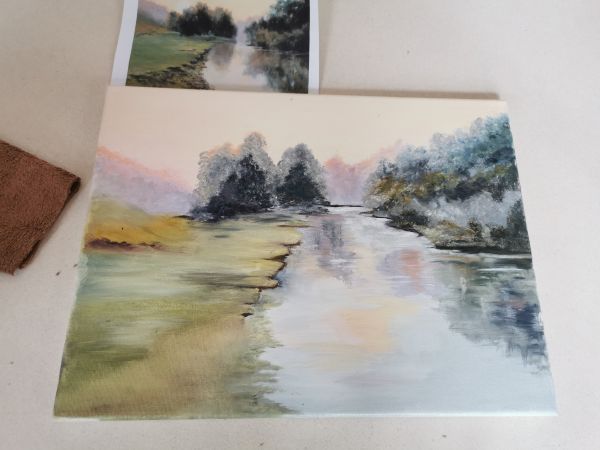 Aujourd’hui donc c’était la dernière séance. Nous sommes revenues avec nos tableaux et Liliane nous a montré comment faire un glacis. C’est une couche d’huile de lin et de quelques gouttes d’essence à la térébenthine.